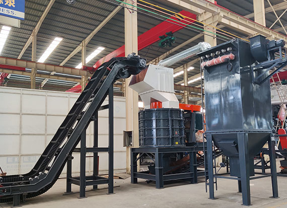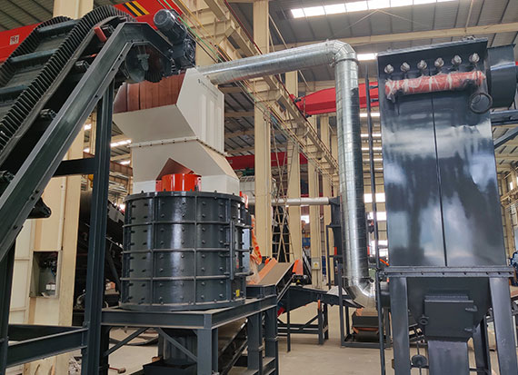 破碎線主機殼體采用特厚鋼板制造,內(nèi)襯為高錳鑄鋼件,可更換;主機轉(zhuǎn)子盤安裝于水平軸上,轉(zhuǎn)子盤圓周分布有銷軸,軸向懸有錘頭;主軸用滾珠軸承支撐,循環(huán)油強制潤滑冷卻,并裝有溫度傳感器;進料口裝有液壓輥筒喂料裝置,位置一高一低,同向旋轉(zhuǎn),能將大件松散物料壓扁,送入破碎腔內(nèi)。