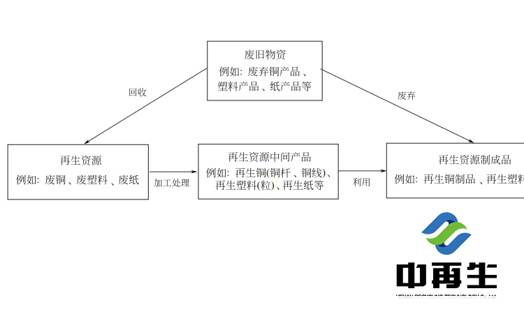 再生資源是指來(lái)源于社會(huì)生產(chǎn)和生活消費(fèi)過程的各類廢棄物,經(jīng)過回收、加工和利用等環(huán)節(jié),可以重新獲得使用價(jià)值的物質(zhì)。此外,對(duì)符合國(guó)家環(huán)??刂茦?biāo)準(zhǔn)的進(jìn)口可用作原料的固體廢物也是中國(guó)再生資源的一個(gè)重要來(lái)源。需要注意的是,再生資源與再生資源產(chǎn)品的概念有區(qū)別。例如再生銅、再生鋁、再生塑料等概念是指廢舊銅、鋁和塑料經(jīng)過回收、分揀、熔煉、拉絲造粒等環(huán)節(jié)加工而成的中間再生資源產(chǎn)品,為制造企業(yè)深加工得到再生資源的制成品提供原料,如圖所示: